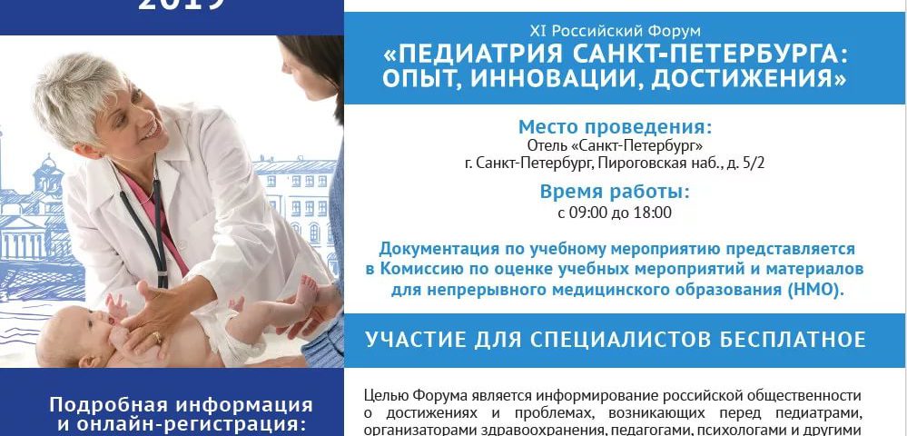 27-28 сентября 2019 в Санкт-Петербурге прошел XI Российский форум «ПЕДИАТРИЯ САНКТ-ПЕТЕРБУРГА: ОПЫТ, ИННОВАЦИИ, ДОСТИЖЕНИЯ». Целью Форума являлось информирование российской общественности о достижениях и проблемах, возникающих перед педиатрами, организаторами здравоохранения, педагогами, психологами и другими специалистами при оказании различных видов медицинской помощи детям и выработке новых подходов к воспитанию здорового подрастающего поколения в современных условиях.
